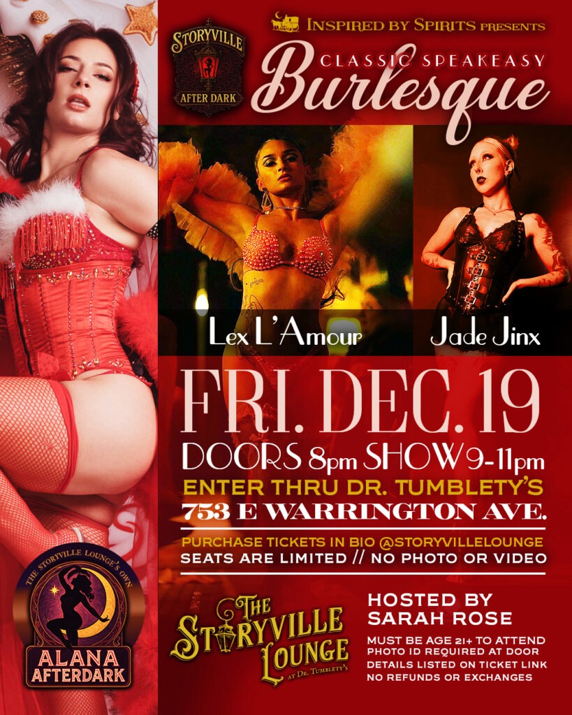Monthly classic burlesque performances by Storyville Lounge’s Own, Alana AfterDark with special guests.